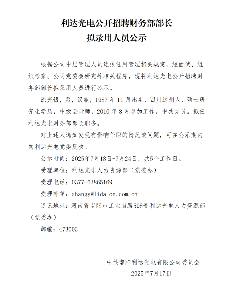 - (2025-07-17)利达光电公开招聘财务部部长拟录用人员公示